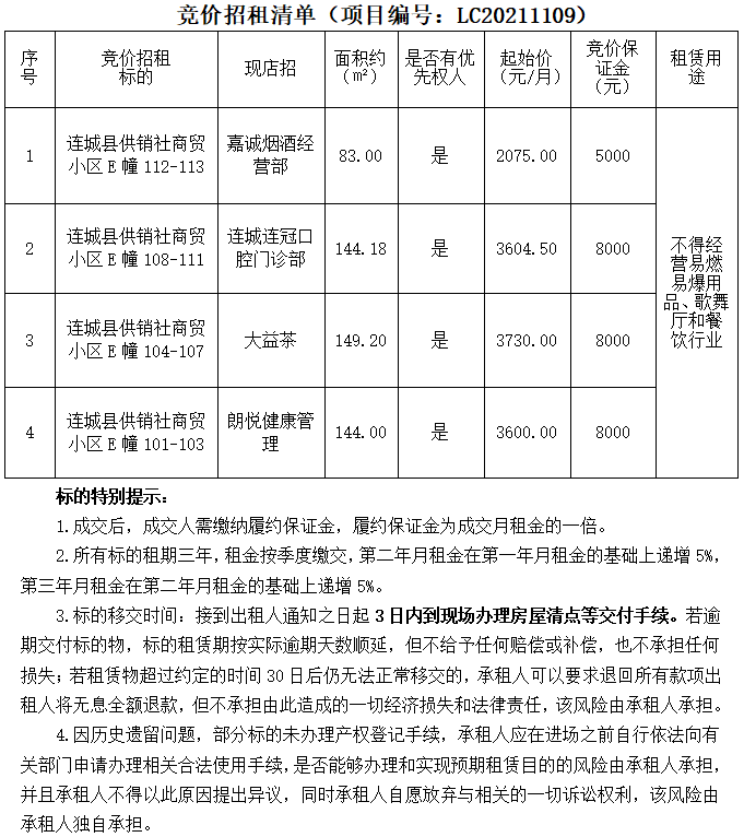 受委托,我司定于2021年11月9日上午09:30在权益云交易平台(网址:https://www.unibid.cn/)采用正向一次性报价的方式公开竞价招租连城县供销社商贸小区E幢一层所有店面(详见《竞价招租清单》)。
