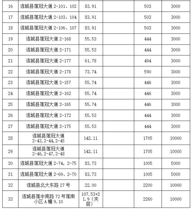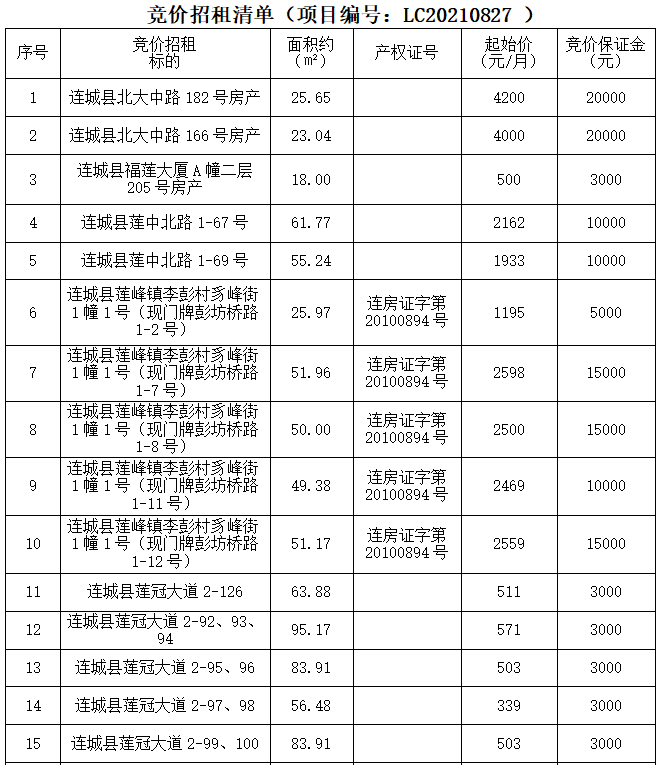 [竞价招租公告]2021年8月27日连城县北大中路、福莲大厦、莲中北路、李彭村豸峰街、莲冠大道、北大东路、莲中南路等33处房产三年租赁权