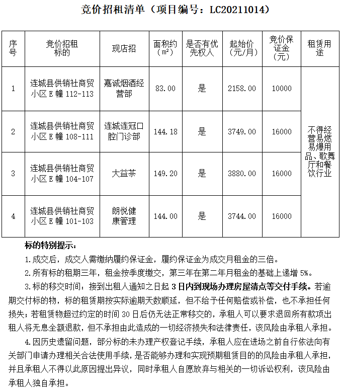 2021年10月14日连城县供销社商贸小区E幢一层所有店面三年租赁权