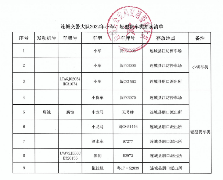 2022年11月7日公安机关依法处置的拆解报废轻型类货车及小型轿车公开竞价转让